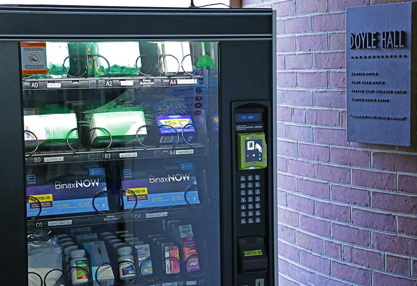 The machine, located just outside the primary entrance to Doyle Formal, was funded through a grant from the American College Health Association. Other available items include personal protective equipment, first aid materials, personal care products, and several over-the-counter medications. View the full list of available items.